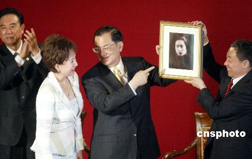 中新網(wǎng)4月29日電 中國國民黨主席連戰(zhàn)在北大演講結(jié)束后,北京大學(xué)校務(wù)委員會(huì)教授李云放教授向連戰(zhàn)贈(zèng)送兩件具有特殊意義的北京大學(xué)的紀(jì)念品。連戰(zhàn)并向北京大學(xué)回贈(zèng)了禮物。