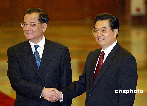 其時,兩位領(lǐng)導(dǎo)人同著深色西服,胡錦濤系紅色領(lǐng)帶,連戰(zhàn)系藍色領(lǐng)帶。