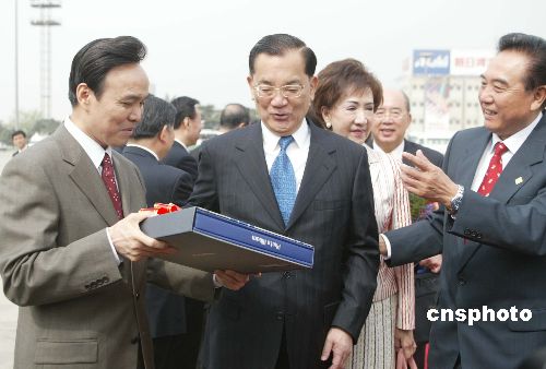 四月三十日,中國國民黨主席連戰(zhàn)結束北京之行啟程前往西安,中共中央臺辦主任陳云林、北京市委副書記龍新民在機場為其送行。圖為連戰(zhàn)獲贈北京之行紀念像冊分外驚喜。作者:廖文靜