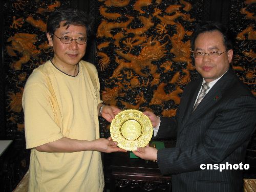中新社東京五月一日電 今天中午十二點(diǎn)整,來(lái)自日本橫濱的公司職員近藤英男高興地從愛(ài)知世博會(huì)中國(guó)館館長(zhǎng)孫鋼手里接過(guò)一面紀(jì)念金盤,他幸運(yùn)地成為中國(guó)館自三月二十五日開館以來(lái)接待的第一百萬(wàn)位觀眾。