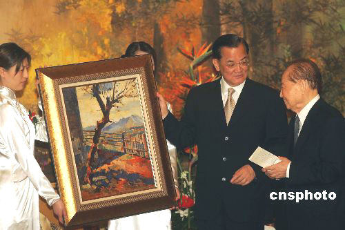連戰(zhàn)并向汪老贈(zèng)送了辜振甫夫人托他轉(zhuǎn)交的兩件禮物,一是辜老先生生前的一幅親筆畫作,另一個(gè)則是辜振甫夫人嚴(yán)倬云女士的信件。