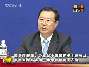 有外國記者在記者會上提問:陳水扁說希望胡錦濤訪問臺灣,您對此有何評價?同時您說連戰(zhàn)主席這次訪問大陸的時候,對于和平的問題有了一些進展,我想問有沒有談到對臺設(shè)置導(dǎo)彈的問題?如果談到的話,是否會撤除這些導(dǎo)彈?如果撤除的話,撤除多少導(dǎo)彈?如果沒有談到這個問題,為什幺沒有?