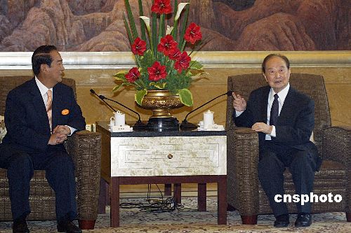 五月八日,海峽兩岸關(guān)系協(xié)會(huì)會(huì)長汪道涵在上海會(huì)見了由親民黨主席宋楚瑜率領(lǐng)的親民黨大陸訪問團(tuán)。作者:廖文靜