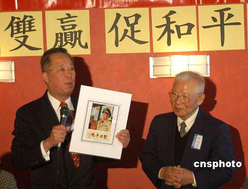 當?shù)貢r間五月七日,華盛頓“榮光會”會長李昌緒(左)向臺灣“新同盟會”會長許歷農(nóng)(右)贈送照片。許歷農(nóng)曾經(jīng)擔(dān)任國民黨軍隊高級將領(lǐng),幾年前因不滿李登輝而退出國民黨的許歷農(nóng)最近又回到國民黨。作者:余東暉