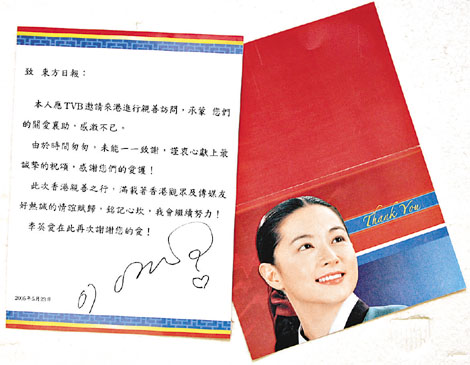 李英愛原定昨日中午十二時(shí)十五分乘車往機(jī)場(chǎng),但由于她堅(jiān)持要在送贈(zèng)各大傳媒的答謝卡上簽名,因而延遲至十二時(shí)四十五分才離開酒店。薄施脂粉的“長今”,手挽LV袋,配襯牛仔褲,精神奕奕地步出酒店,當(dāng)她發(fā)現(xiàn)在場(chǎng)有十多名fans守候,隨即主動(dòng)走近,并為他們逐一簽名留念,才上車前往機(jī)場(chǎng)。