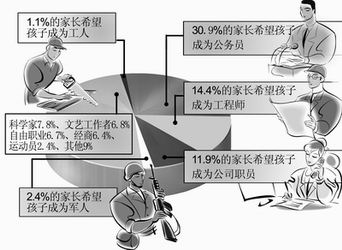 但調(diào)查同時顯示,家長對孩子未來期望過高。近三分之一的父母希望自己的孩子將來能夠成為公務(wù)員,只有1.1%的家長希望孩子成為工人(見圖1)。父母對孩子的希望一定程度上反映了當今社會的一種價值取向。