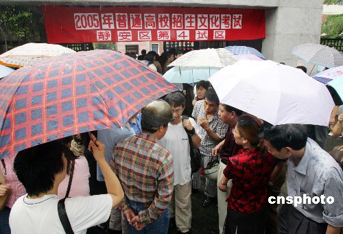六月七日,二○○五全國高考在各地同時拉開帷幕,今年全國考生人數(shù)為八百六十七萬,上海有十一萬考生今起走進(jìn)考場,一些家長等在考場外冒雨“陪考”。作者:湯彥俊