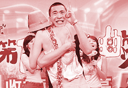 黃立行極力爭(zhēng)取林志玲的擁抱,“金曲獎(jiǎng)那天我看到王力宏抱她,差點(diǎn)想K他!绷种玖岵灰捎兴瑥堥_(kāi)雙臂擁抱,黃立行雙手摟住她的腰和背部,不但用力,還露很‘爽’的表情,“我現(xiàn)在沒(méi)有女友,有也變沒(méi)有了!弊詈笊钋榈卣f(shuō):“我是全世界最幸運(yùn)的男人!比珗(chǎng)人笑壞了,林志玲尷尬地羞紅臉說(shuō):“我覺(jué)得害羞傻眼!
