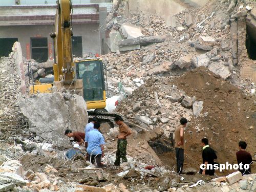 此時(shí),涉嫌私藏炸藥的嫌疑人張學(xué)泉家的“遺址”上,大型挖掘機(jī)正在一個(gè)個(gè)帶白色遮陽帽的人的指揮下,在挖已被夷為平地的房子殘?jiān)、高如小山的瓦礫和碎磚塊。