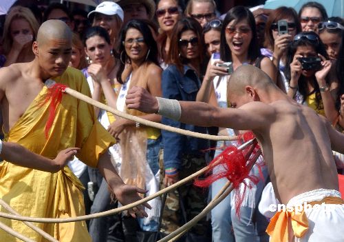6月12日下午,來自世界各地的2005國際旅游小姐來到鄭州境內(nèi)的登封少林寺,感受了一下中國功夫的魄力,尖叫、贊嘆、驚奇、神秘,少林寺迷住了她們。作者:馬健