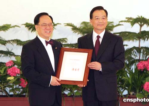 今天的人民大會(huì)堂香港廳懸掛著鮮艷的國(guó)旗和香港特別行政區(qū)區(qū)旗。上午九時(shí),在莊嚴(yán)的國(guó)歌聲中,宣誓就職儀式開(kāi)始。儀式由國(guó)務(wù)委員、國(guó)務(wù)院秘書(shū)長(zhǎng)華建敏主持。他首先宣讀了任命曾蔭權(quán)為香港特別行政區(qū)行政長(zhǎng)官的國(guó)務(wù)院第四百三十七號(hào)令。隨后,曾蔭權(quán)面向溫家寶總理宣誓。宣誓完畢,溫家寶向曾蔭權(quán)頒發(fā)了國(guó)務(wù)院令。
