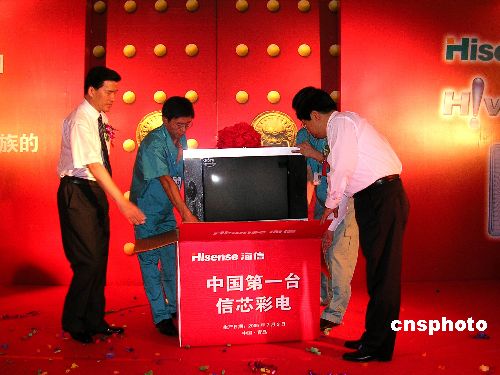 中新社青島七月二日電 (記者 修建華)裝有中國(guó)音視領(lǐng)域第一塊自主產(chǎn)權(quán)、產(chǎn)業(yè)化的數(shù)字電視處理芯片的“信芯”彩色電視,今天下午在海信集團(tuán)的青島、遼寧、貴陽(yáng)、淄博、臨沂五大彩電生產(chǎn)基地同時(shí)下線。至此,年產(chǎn)七千三百萬(wàn)臺(tái)彩電的中國(guó)全部依賴外國(guó)芯片的歷史宣告結(jié)束。