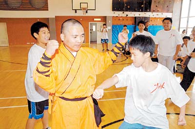 中新網(wǎng)7月19日電 據(jù)香港商報(bào)報(bào)道,嵩山少林寺易筋洗髓傳人釋延王禪師昨日來(lái)港,向參加“少林武術(shù)健體訓(xùn)練營(yíng)”的百名青少年“傳功”,修習(xí)拳法及內(nèi)功心法入門,務(wù)求推動(dòng)少林武術(shù)文化的傳播。