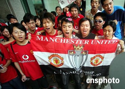 英超豪門(mén)曼聯(lián)隊(duì)昨日抵達(dá)北京,開(kāi)始他們的中國(guó)之行。在未來(lái)的幾天中,他們將與中國(guó)的球迷以及媒體見(jiàn)面,并將與北京現(xiàn)代隊(duì)進(jìn)行一場(chǎng)友誼賽。圖為曼聯(lián)球星抵達(dá)北京后,中國(guó)球迷熱烈歡迎。