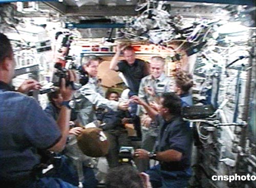 航天飛機(jī)發(fā)現(xiàn)號(hào)是7月28日7時(shí)18分(北京時(shí)間19時(shí)18分)和國(guó)際空間站軌道對(duì)接,經(jīng)過(guò)密封檢查,機(jī)組于美國(guó)東部時(shí)間8:50進(jìn)入國(guó)際空間站。七名宇航員結(jié)束了兩天奔向空間站的飛行,這是自美國(guó)航天飛機(jī)2002年12月離開(kāi)后,如今第一次造訪空間站。兩個(gè)機(jī)組會(huì)師太空,相互擁抱問(wèn)候。