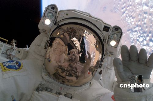 圖:“發(fā)現(xiàn)號”宇航員太空行走 放眼浩瀚宇宙