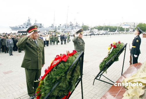八月十八日,中國(guó)解放軍和俄羅斯軍隊(duì)的總參謀長(zhǎng)梁光烈(左)與巴魯耶夫斯基一起向俄羅斯“太平洋艦隊(duì)?wèi)?zhàn)斗榮譽(yù)”紀(jì)念碑敬獻(xiàn)花圈,向在衛(wèi)國(guó)戰(zhàn)爭(zhēng)中英勇?tīng)奚亩砹_斯軍人致以崇高的敬意。作者:王麗南