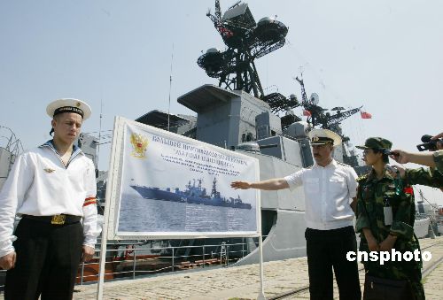 八月二十二日,中國部分媒體被中俄軍事演習(xí)俄軍方邀請,參觀采訪此次參加演習(xí)的俄羅斯反潛艦,這艘?吭谇鄭u港的艦艇正整裝待發(fā),明日將起航參加海上封鎖演習(xí)。圖為該反潛艦艦長介紹艦艇的性能和裝備情況。作者:王麗南