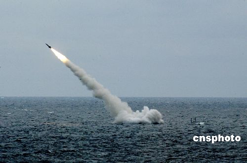 二十三日,“和平使命——2005”中俄聯(lián)合軍事演習(xí)第三階段——實(shí)施交戰(zhàn)的海上封鎖演練在中國(guó)黃海海域進(jìn)行。圖為中國(guó)新型潛艇水下發(fā)射導(dǎo)彈出水瞬間。作者:王麗南