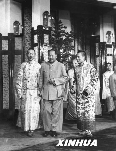 1954年9月,毛澤東在北京接見(jiàn)西藏兩大宗教領(lǐng)袖達(dá)賴?yán)?#183;丹增嘉措(右)和班禪額爾德尼·確吉堅(jiān)贊(左)。