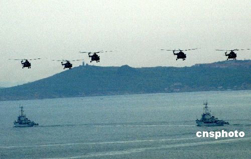八月二十四日,“和平使命—2005”中俄聯(lián)合軍事演習(xí)第三階段兩棲登陸作戰(zhàn)實(shí)兵演練在山東半島展開(kāi)。圖為直升機(jī)呈梯級(jí)在艦艇上空盤旋掩護(hù)艦艇向岸防挺進(jìn)。作者:王麗南
