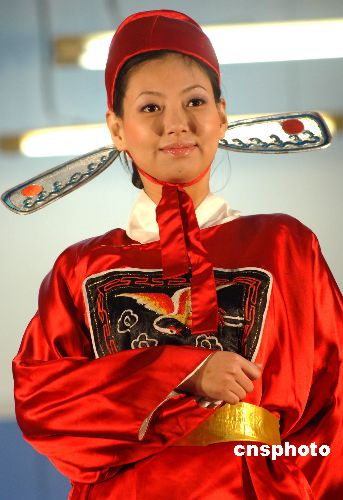 一月二十八日,北京“第二十一屆地壇春節(jié)文化廟會”中國古代時裝展上,一款具有古為今用特點的明代狀元裝亮相。作者:鄒憲