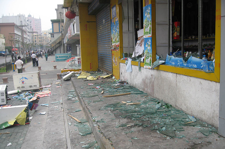 7月6日,烏魯木齊市被犯罪分子洗劫的一家商店。在5日晚發(fā)生的嚴重暴力犯罪事件中,已造成140人死亡,800多人受傷;被毀車輛達260部;受損門面房203間,民房14間,總過火面積達到56850平方米,全市共有220多處縱火點,有兩棟樓房被燒毀。中新社發(fā) 鐘新 攝