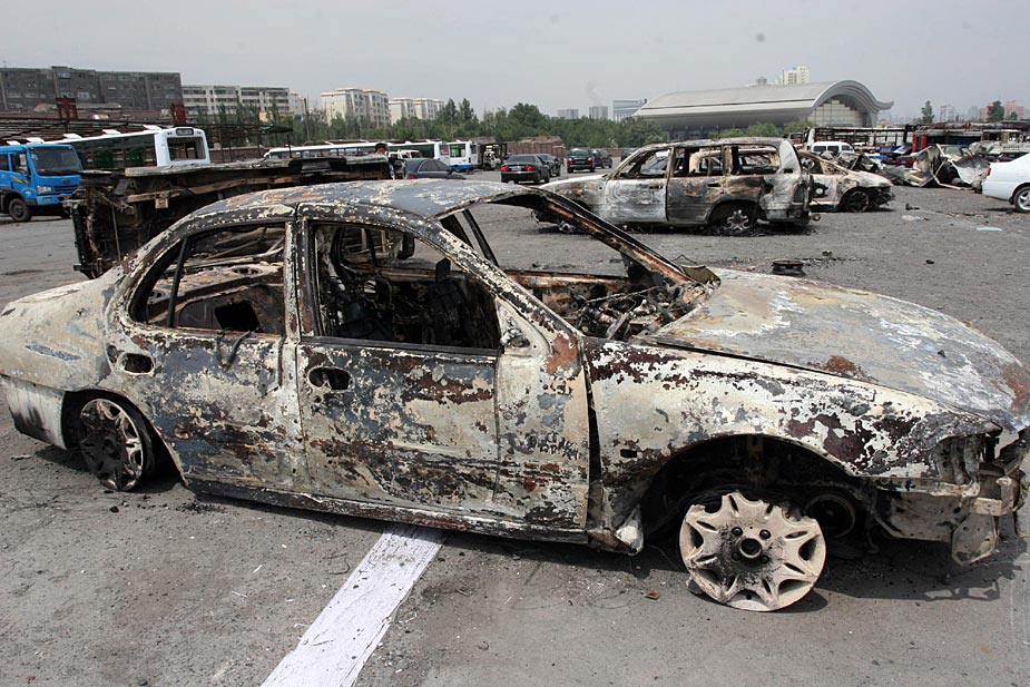 7月6日,烏魯木齊街頭被犯罪分子焚毀的汽車慘不忍睹。在5日晚發(fā)生的嚴(yán)重暴力犯罪事件中,已造成140人死亡,800多人受傷;被毀車輛達(dá)260部;受損門面房203間,民房14間,總過(guò)火面積達(dá)到56850平方米,全市共有220多處縱火點(diǎn),有兩棟樓房被燒毀。中新社發(fā) 夏春平 攝
