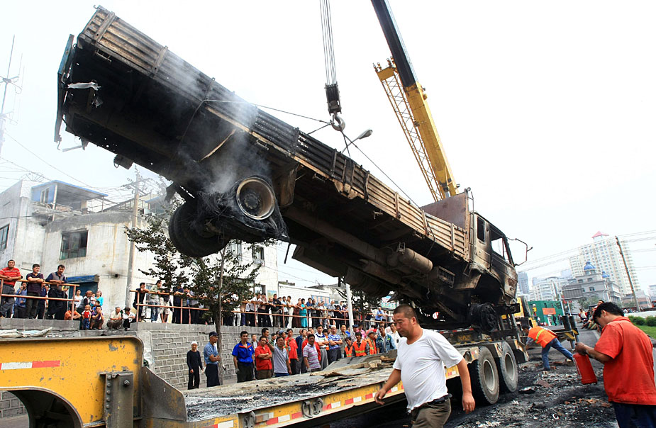 7月6日,烏魯木齊市的工作人員在清理被犯罪分子焚燒的汽車。在5日晚發(fā)生的嚴(yán)重暴力犯罪事件中,已造成140人死亡,800多人受傷;被毀車輛達(dá)260部;受損門面房203間,民房14間,總過(guò)火面積達(dá)到56850平方米,全市共有220多處縱火點(diǎn),有兩棟樓房被燒毀。中新社發(fā) 劉新 攝