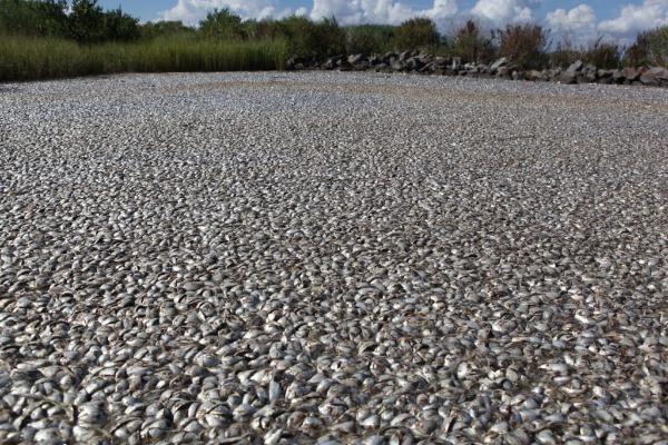 美國(guó)路易斯安那州的一片靠近墨西哥灣的水近日成了令人瞠目結(jié)舌的“死魚(yú)之!保翰挥(jì)其數(shù)的各種死魚(yú)、螃蟹和海鰻的尸體將水面蓋得嚴(yán)嚴(yán)實(shí)實(shí)。當(dāng)?shù)仉娨暸_(tái)記者甚至在這片位于密西西比河入海口的水域中發(fā)現(xiàn)了一頭鯨魚(yú)的尸體。各方因此呼吁當(dāng)?shù)卣痛苏归_(kāi)調(diào)查。
