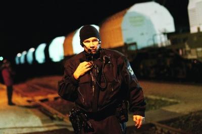 11月8日,在德國丹嫩貝格,一名防暴警察在運(yùn)載核廢料的列車旁工作。