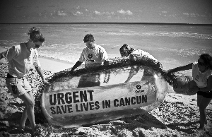 11月28日,墨西哥坎昆,環(huán)保人士在海邊游玩,他們身旁為國際樂施會(huì)放置的巨型瓶子,瓶中寫有呼吁環(huán)保的標(biāo)語。
