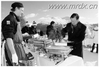 午餐時(shí)分,與會(huì)代表們紛紛裹緊外套,穿上大衣,離開暖氣燒得火熱的餐廳,來一頓戶外露天午餐。幕天席地與自然環(huán)境親密接觸,不失為親身體驗(yàn)氣候變化的好方法。但愿面對冰天雪地飽餐的同時(shí),代表們能思考出應(yīng)對氣候變化的更好辦法。