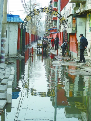 據(jù)居民介紹,西馬場(chǎng)北里只有這一條東西走向的胡同,居民出門、購(gòu)物都必須走這條路?涩F(xiàn)在路面每天汩汩往外冒臭水,人們只好用方磚沿著胡同北面鋪了一條窄路勉強(qiáng)通行,而現(xiàn)在那些方磚也被臭水淹沒了,居民通行更加困難。