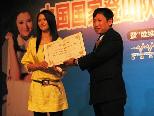 中新社北京三月三十一日電(記者 張希敏)今天,青年歌手譚維維從中國國家體育總局登山運(yùn)動管理中心領(lǐng)導(dǎo)手中接過授予函,至此,她已成為中國登山隊(duì)音樂形象大使,并作為北京奧運(yùn)會珠峰圣火放歌第一人。