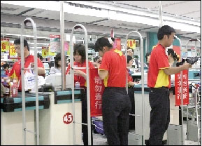 昨天上午9點(diǎn)半左右,在白石橋方圓店,家樂福店員們穿著紅黃兩色的新裝,胸前印著國(guó)旗,有的帽子上印著“beijing2008”字樣,有的印著五環(huán)和中國(guó)印等標(biāo)識(shí)。記者隨后又來到家樂福中關(guān)村店和國(guó)展店,兩店的員工也大多身著新裝頭戴新帽。國(guó)展店一位女店員說,4月26日,店里給員工發(fā)了新的員工裝,據(jù)說成本是帽子80元、上裝近200元。