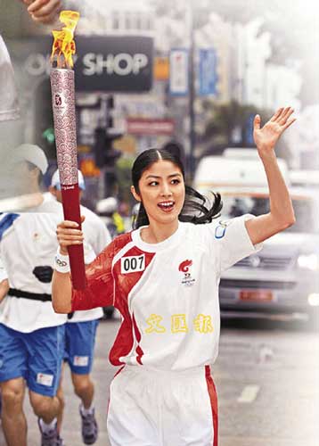 汪明荃昨日盛裝打扮出任火炬手,沿途不斷和市民打招呼。阿姐事后表示,心情興奮。她會(huì)將火炬放在辦公室,她亦表示會(huì)把火炬帶去供天水圍的小朋友拍照,因?yàn)樵谒艿男谐讨,聽到好多小朋友大叫:“加油!中國加油!? 植毅儀、李慶全、黃國強(qiáng))
