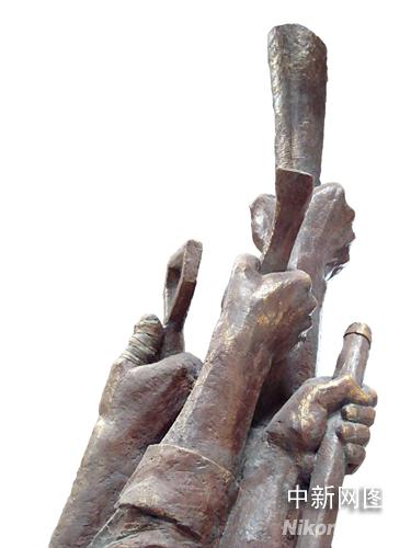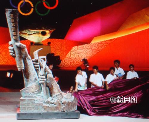 中新網(wǎng)北京6月2日電 (記者 賴海隆)5月31日晚,一尊名為“高擎圣火,克難興邦”的“5.12”大型紀(jì)念雕塑出現(xiàn)在“2008奧運(yùn)景觀雕塑方案征集大賽頒獎(jiǎng)活動(dòng)”現(xiàn)場。專程從重災(zāi)區(qū)趕來的十余名北川中學(xué)的幸存者與作者一起共同為此尊雕塑揭幕。這一象征中國人表達(dá)自強(qiáng)不息,重建家園,辦好奧運(yùn)決心的一幕,將現(xiàn)場氣氛推向了高潮。