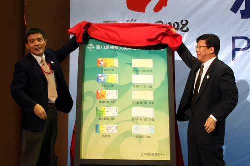 北京奧運(yùn)票務(wù)中心主任朱炎、副主任于喜來(lái)揭曉北京殘奧會(huì)門(mén)票票樣。