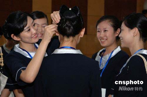 參加北京奧運(yùn)會頒獎(jiǎng)儀式的專業(yè)志愿者正在互相整理發(fā)型。中新社發(fā) 王東明 攝