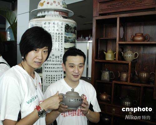 7月12日,“2008奧林匹克文化中國(guó)行”在海南三亞開幕。作為全國(guó)巡展的首站,三亞的展覽活動(dòng)歷時(shí)兩天,公開展示由226名書畫家共同創(chuàng)作的奧運(yùn)主題大型書畫作品《神州圣火傳遞圖》和《神州圣火傳遞頌》。作品全面描繪了113個(gè)火炬?zhèn)鬟f城市的風(fēng)土人情;顒(dòng)期間還展出奧運(yùn)文化優(yōu)秀作品“中華紫砂壺”和“盛世將軍瓶”。圖為1996年亞特蘭大奧運(yùn)會(huì)游泳冠軍樂靜宜(左)和2000年悉尼奧運(yùn)會(huì)跳水冠軍肖海亮(右),在“中華紫砂壺”和“盛世將軍瓶”前展示“中華紫砂壺”。中新社發(fā) 尹海明 攝