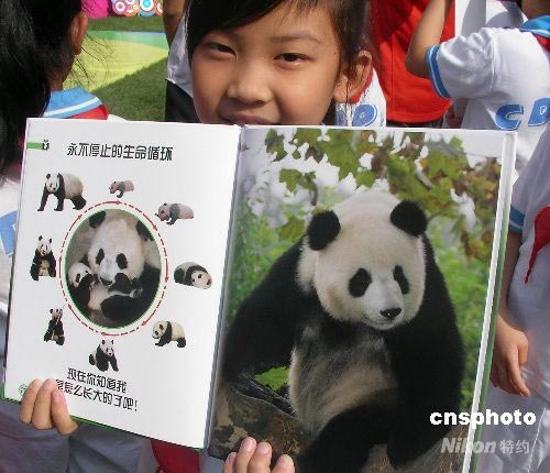 7月16日上午,全球首本由奧運(yùn)大熊貓“晶晶”擔(dān)任主角的科普圖書——《我是晶晶-熊貓成長寫真》中文版在成都大熊貓繁育研究基地舉行了全球首發(fā)儀式。該書歷時兩年策劃、設(shè)計,由企鵝集團(tuán)著名的多林金德斯利公司著,童趣出版有限公司編譯,人民郵電出版社出版發(fā)行。為表達(dá)對震后四川、成都的關(guān)愛,該書的全球首發(fā)儀式安排在成都舉行。中新社發(fā) 楊杰 攝