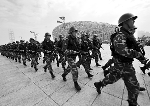 “服從命令、聽從指揮、忠于職守、英勇善戰(zhàn)……”昨日上午9時,鳥巢與水立方之間的廣場上,武警北京總隊某部1500名官兵代表緊攥右拳,向國旗和國際奧委會會旗宣誓。奧運期間,這支武警部隊將負責(zé)奧運最核心區(qū)域、賽事的警衛(wèi)及處突反恐工作,是北京賽區(qū)任務(wù)最重、用兵量最大、投入安保時間最長的部隊。