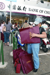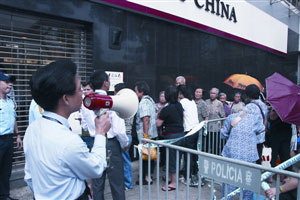 圖:澳門銀行門外有人收集奧運(yùn)鈔。(圖片來源:澳門日報(bào))