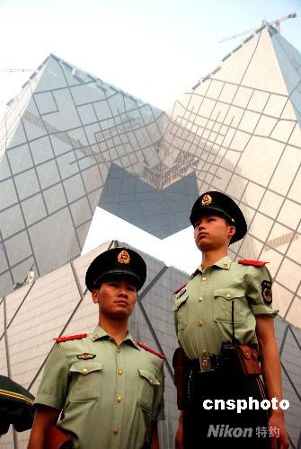 7月23日,北京武警正式進駐中央電視臺新址,開始擔(dān)負(fù)中央電視臺的安全保衛(wèi)任務(wù)。奧運電視報道新聞中心近日將在中央電視臺新址開始啟用。中新社發(fā) 楊慧峰 攝