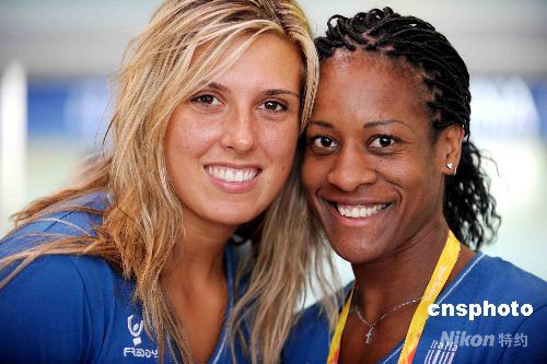 8月2日下午,意大利男排和女排運動員抵達北京首都國際機場,征戰(zhàn)北京奧運會。圖為意大利女排球星阿奎羅(右)和主攻手皮其尼尼在一起。 中新社發(fā) 陳文 攝