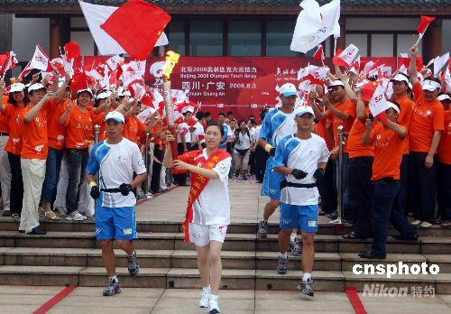 8月3日,奧運圣火開始在四川傳遞,抗震英模蔣敏跑出廣安傳遞首棒火炬。彭州市公安局光明路派出所教導(dǎo)員蔣敏在“5·12”汶川大地震中,痛失10位親人仍然頑強奮戰(zhàn)在抗震救災(zāi)的第一線、感動了億萬中國人、被授予一級英模、被網(wǎng)友稱為“中國最美女警”、被公安部長稱贊是“全國最堅強的女警花”。 中新社發(fā) 廖攀 攝