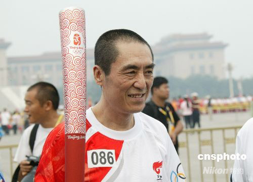 8月6日上午,北京奧運(yùn)會圣火在北京市傳遞。著名電影導(dǎo)演、奧運(yùn)開幕式總導(dǎo)演張藝謀擔(dān)任火炬手傳遞奧運(yùn)火炬,在結(jié)束火炬?zhèn)鬟f后張藝謀感慨萬分,激動(dòng)不已。 中新社發(fā) 馬毅行 攝