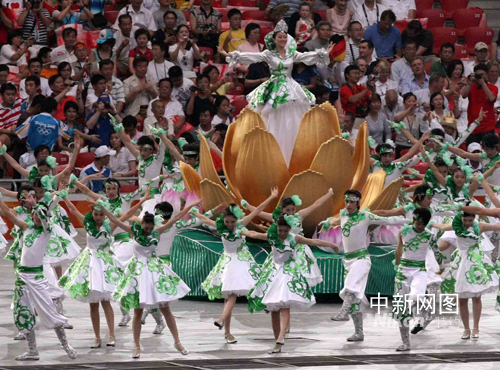 澳門(mén)教業(yè)中學(xué)8月8日晚在北京奧運(yùn)會(huì)開(kāi)幕式之前,在鳥(niǎo)巢上演“澳門(mén)盛世芳蓮?qiáng)W運(yùn)情”歌舞。 中新社記者任晨鳴 攝