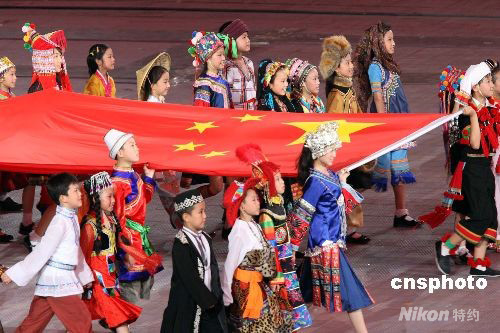 第二十九屆夏季奧運會8月8日晚在北京奧林匹克公園內(nèi)的國家體育場舉行開幕式,中國各民族兒童簇擁著鮮艷的中國國旗入場。 中新社發(fā) 任晨鳴 攝
